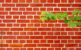 red brick wall, branch with leaves, maple leaves, red, green, pattern, structure, texture, background, wallpaper, colorful, contrasting