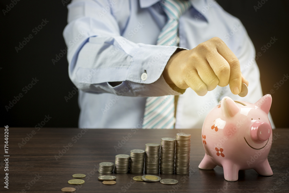 businessman put money coins on piggy bank on wood table, concept as save and investment