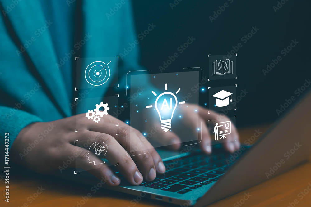 Close-up of hands typing on laptop with glowing AI icons, symbolizing artificial intelligence, innovation, machine learning, digital technology, and modern education concepts technology, academic