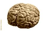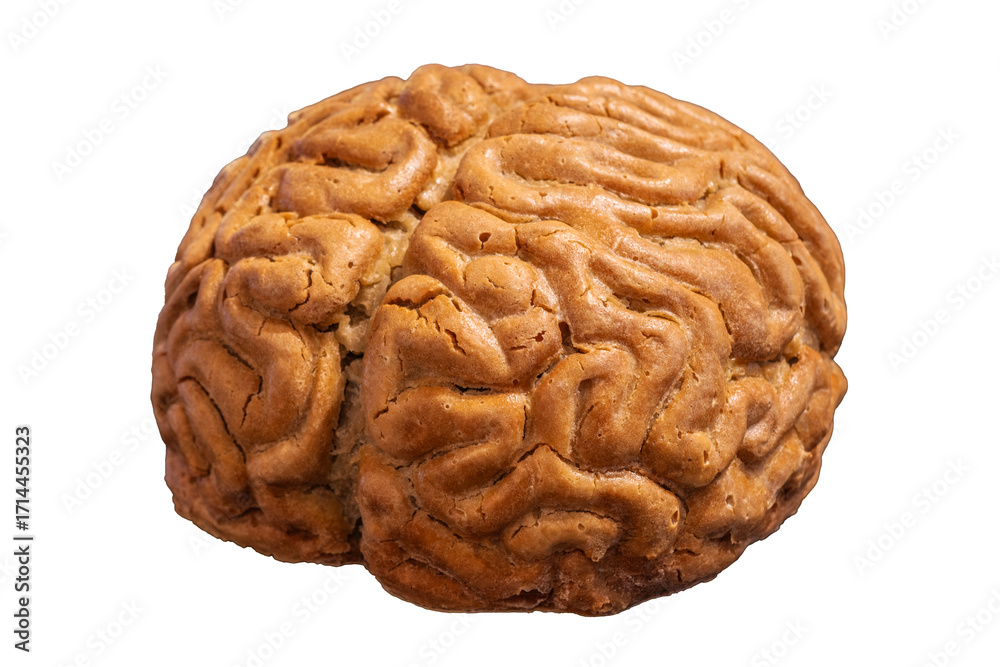 a realistic, brown, sugar-coated brain-shaped pastry. The pastry's surface is detailed with intricate, folded, and wrinkled textures resembling a human brain.
