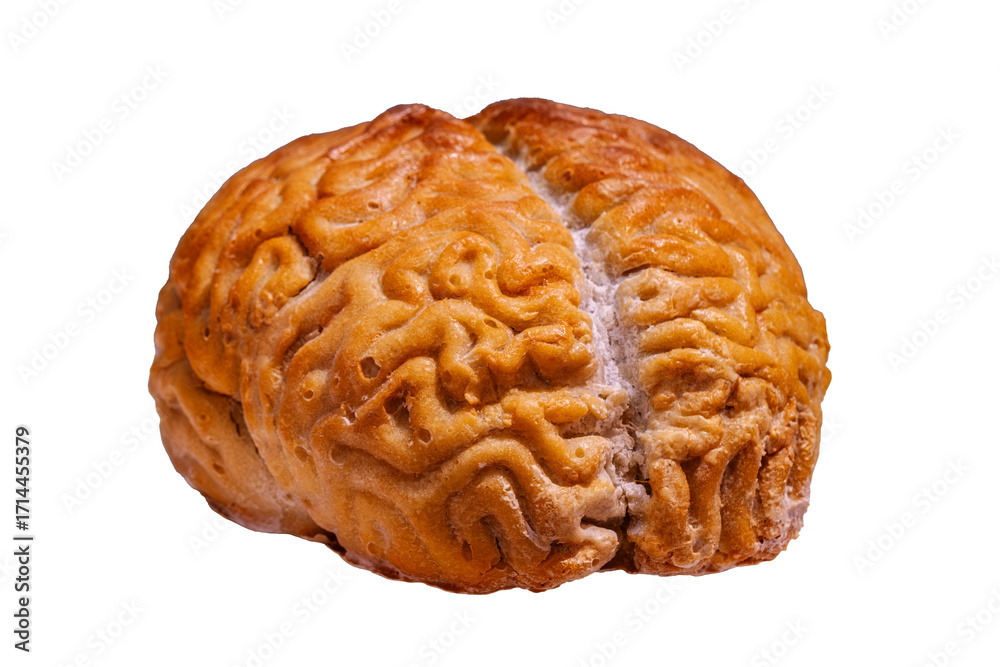 a realistic, brown, sugar-coated brain-shaped pastry. The pastry's surface is detailed with intricate, folded, and wrinkled textures resembling a human brain.