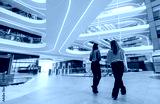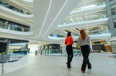 Modern accounting firm lobby with people walking inside