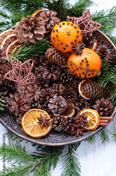 natural decor of dried orange slices, nuts, spices, cones, fresh oranges decorated cloves on wooden table close up. Christmas, New Year, Yule Holidays. festive winter season. top view