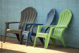 Three chairs in the shade by a blue brick building