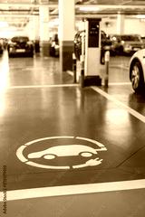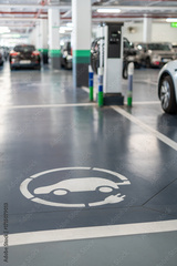 Electric vehicle charging station in underground parking with painted EV symbol on asphalt