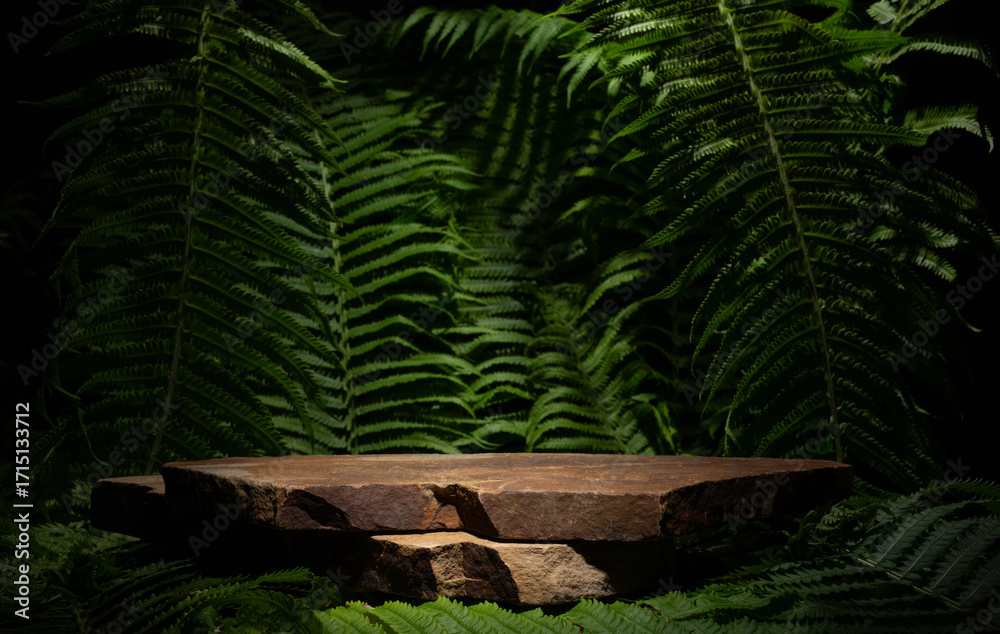 Natural brown stones and green plants for a cosmetics catwalk backdrop. Natural stones for product presentations, perfumes, medicines, jewelry, and cosmetics.