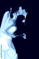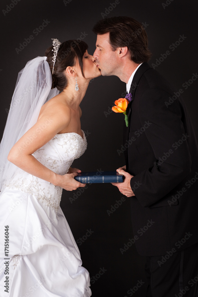 Happy Young Bride and Groom Holding a Bible and Kissing