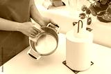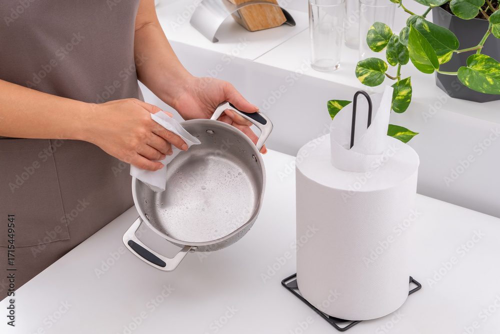 A woman's manicured hands use a paper towel to wipe a metal surface. There is a roll, glasses, and plants on the table. A horizontal photo.