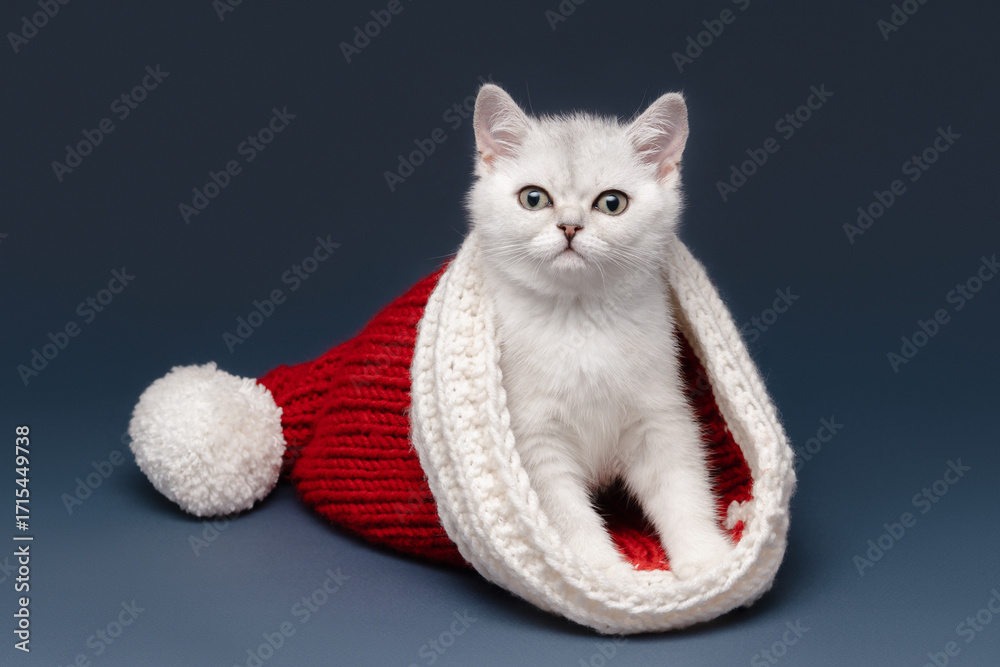 Cute kitten British silver chinchilla sitting in a red knitted Christmas hat on a blue background.Horizontal photo