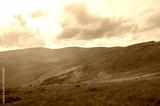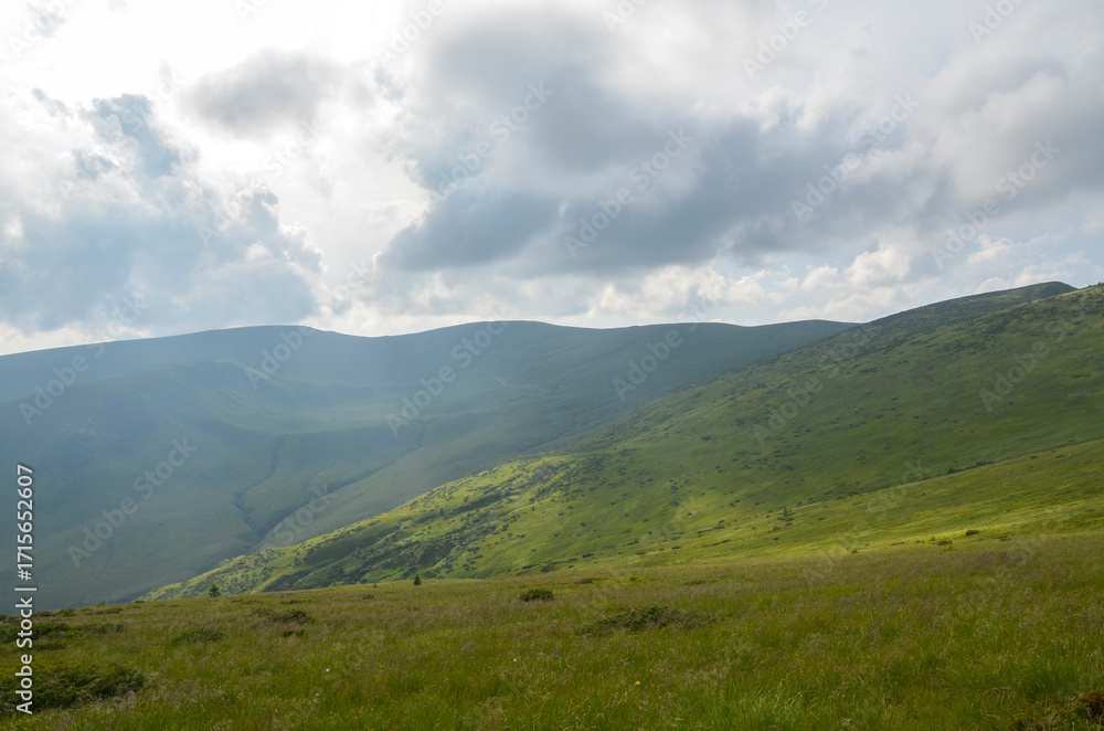 Tranquil landscape of rolling green mountain range under dynamic partly cloudy sky. Serene scene showcasing nature's beauty and the peaceful environment of untouched open spaces. Svydovets Carpathians