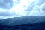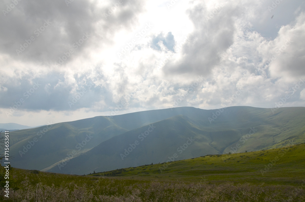 Tranquil landscape of rolling green mountain range under dynamic partly cloudy sky. Serene scene showcasing nature's beauty and the peaceful environment of untouched open spaces. Svydovets Carpathians