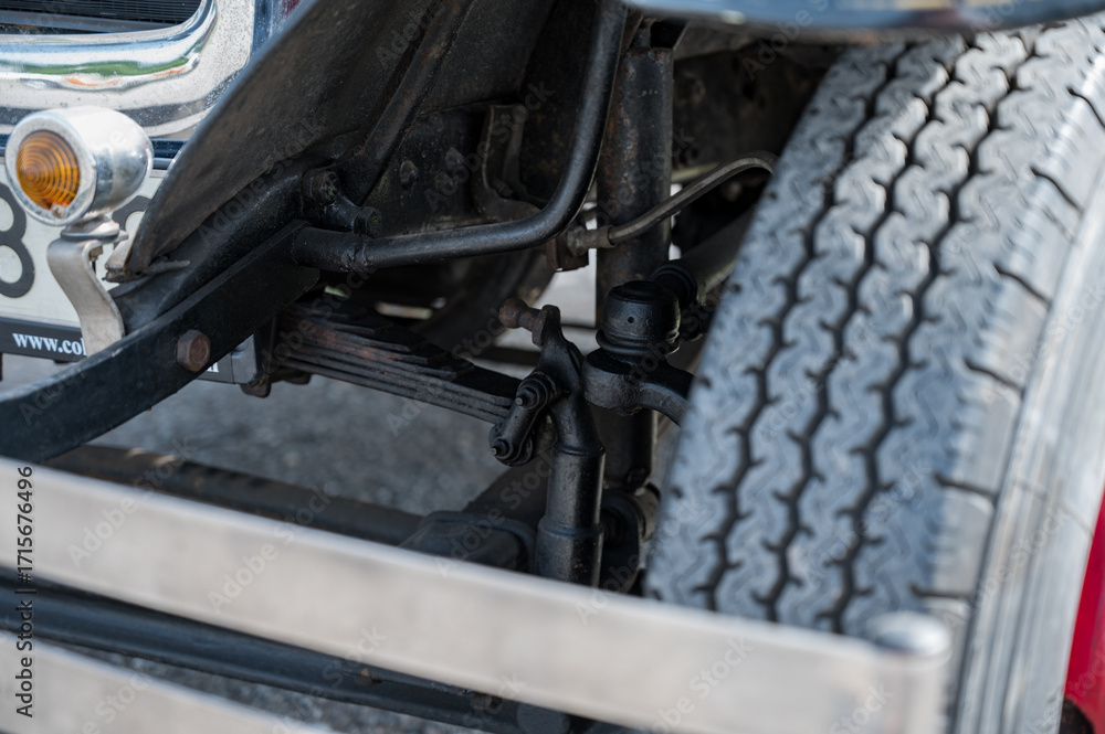 A detailed, close-up shot of the front axle, suspension, and transverse leaf springs on a classic type AA or BB truck