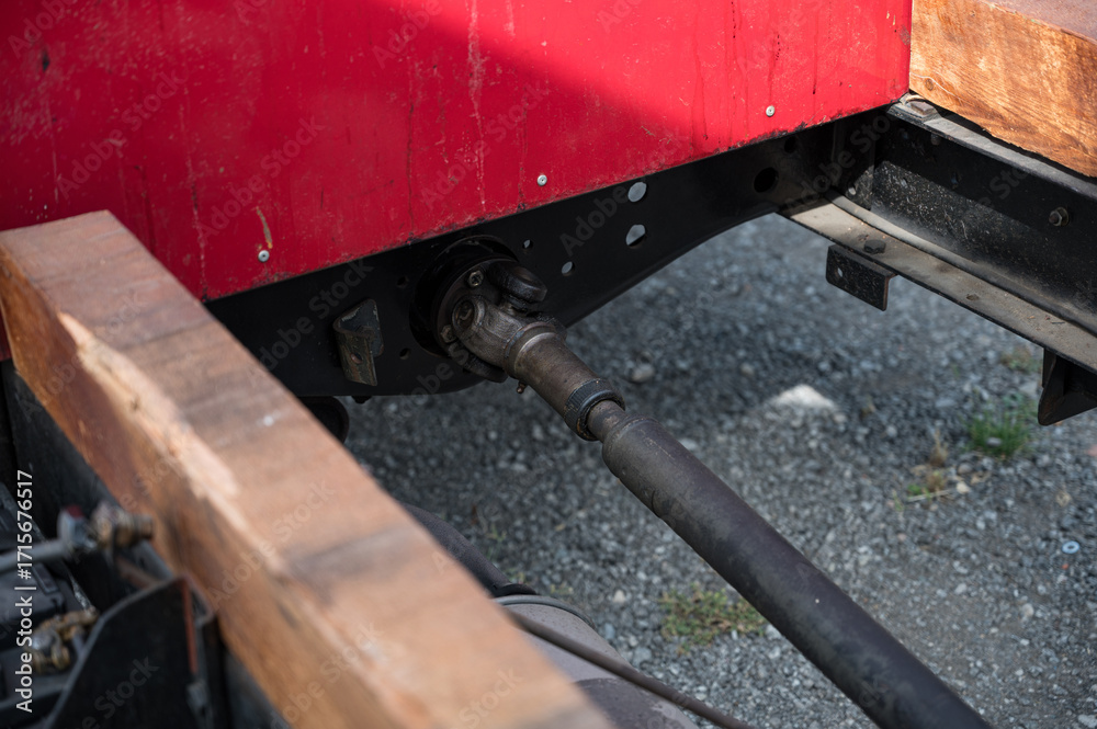 A detailed, close-up shot of the driveshaft and cardan joint on the undercarriage of a classic AA or BB truck with a wooden chassis.