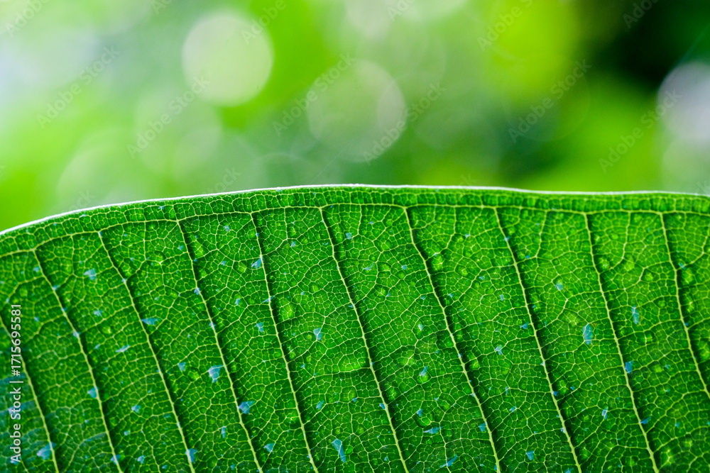 Close up of green leaf with dew drops, nature background.