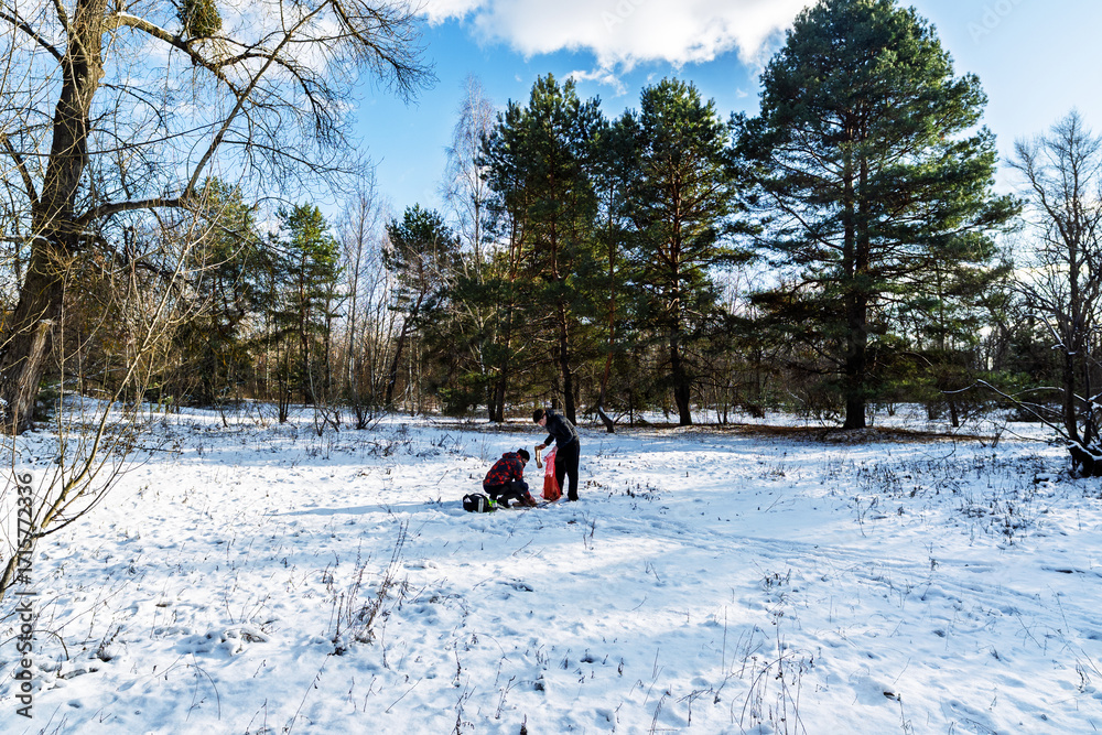 Two people engage in an outdoor activity amidst a snowy forest landscape on a bright winter day. Tall pines and bare trees frame the scene of nature and adventure.
