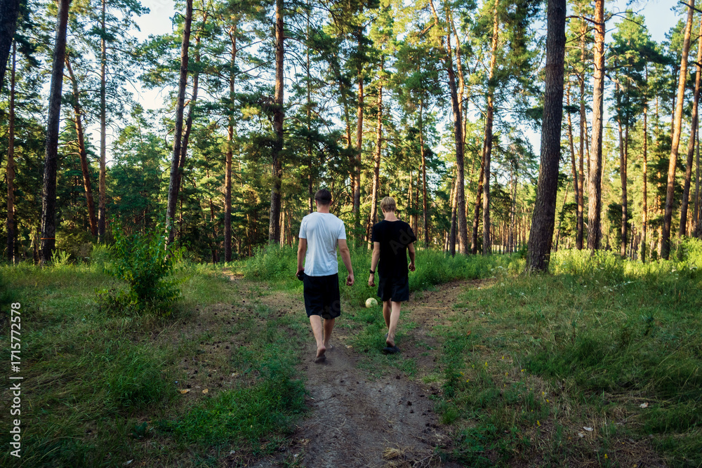 Two young men walk on a dirt path through a sunlit pine forest. A tranquil scene of friendship and outdoor adventure, perfect for themes of nature, leisure, and summer exploration.