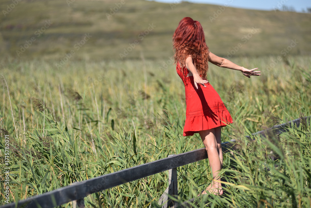 Woman with red hair in red dress walking through scenic natural wetland pathway