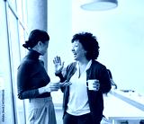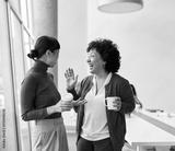 Portrait of two young business woman having a meeting or presentation and seminar standing in the office. Portrait of a young business woman talking