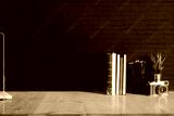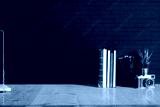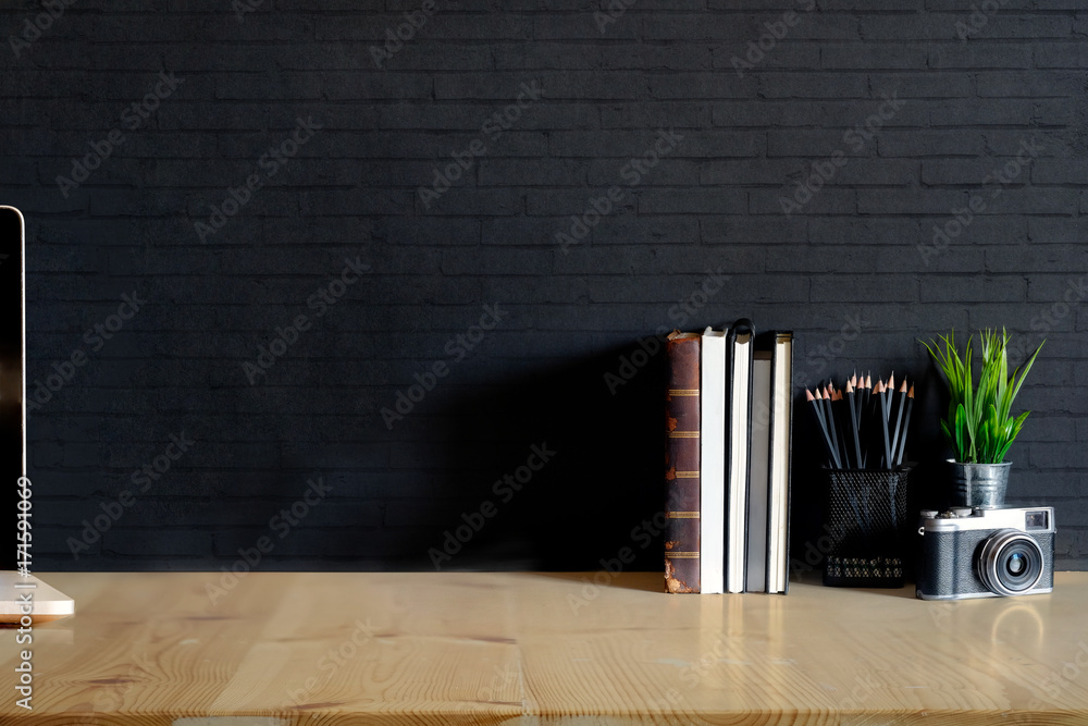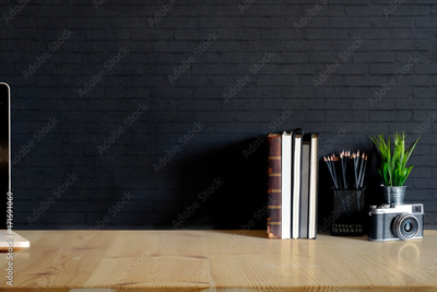 Work space Mock up : wood desk tabletop with notebooks, vintage camera and houseplant. white marble desk with copy space for products display montage.