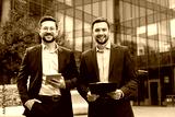 Two smiling businessmen in suits standing together outside a contemporary glass-fronted office, one holding a tablet and the other a clipboard, representing successful teamwork and collaboration