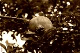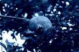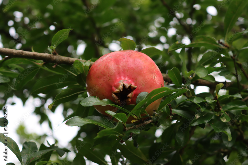 Ripe red Pomegranate fruit on bush with green leaves Punica granatum tree with fruit