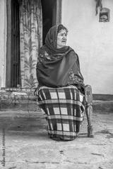 Elderly woman seated outside a traditional home in a rural village during sunny afternoon