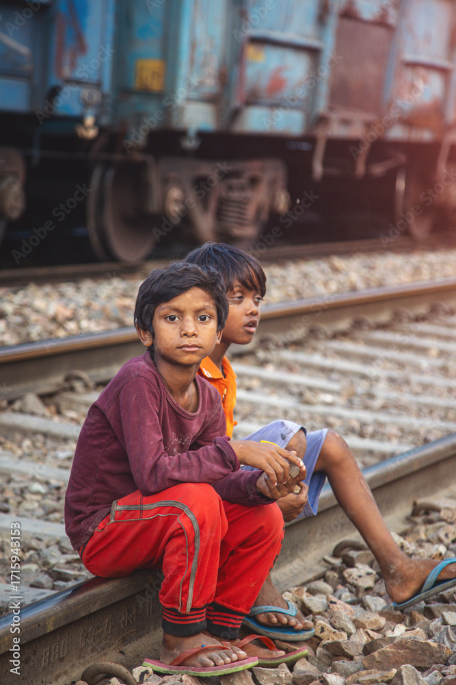 Two Boys Sitting on Railway Tracks Beside Moving Blue Freight Train in Slum Area