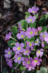 Pink primrose plant in bloom in the garden. Primula vulgaris in springtime