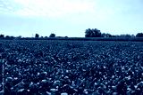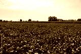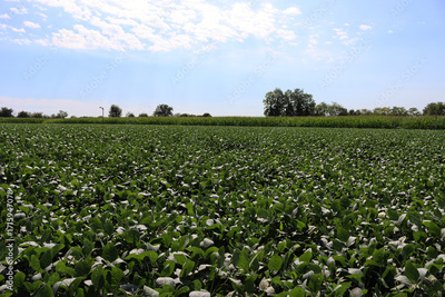 Green soybean and corn fields on a summer sunny day. Agricultural landscape in Italy with blue sky