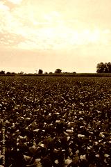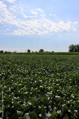 Green soybean and corn fields on a summer sunny day. Agricultural landscape in Italy with blue sky