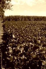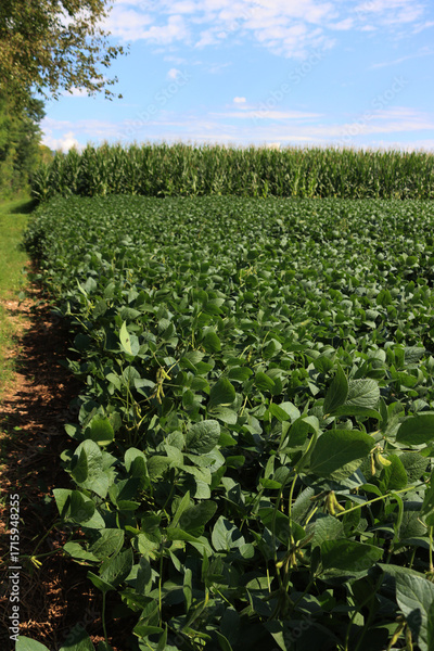 Green soybean and corn fields on a summer sunny day. Agricultural landscape in Italy with blue sky