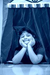 Child enjoying playtime inside colorful curtain tent with red backdrop and cheerful decorations