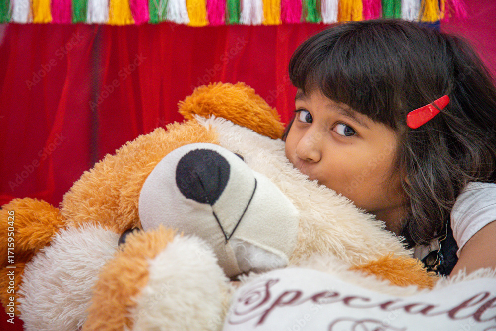 Cheerful Young Girl Hugging Teddy Bear Inside Bright Pink and Blue Tent