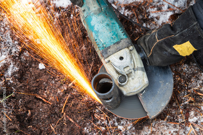 Angle grinder sparks as a worker cuts metal pipe outdoors