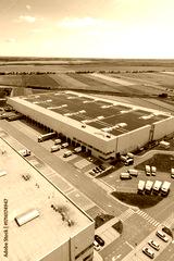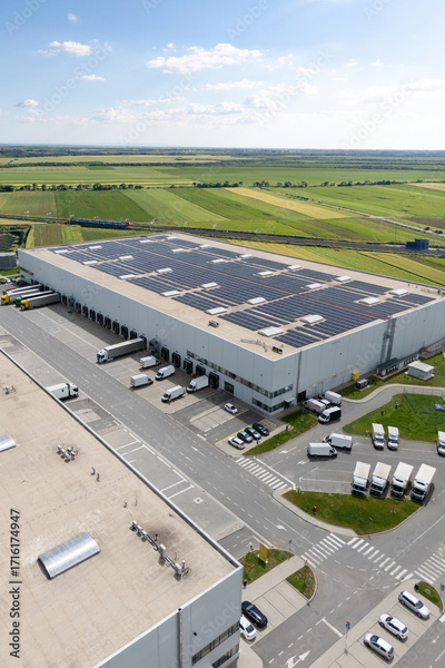 Logistics centers with solar panels on roofs. Aerial view
