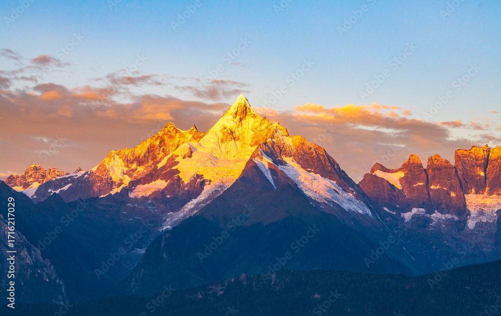 Beautiful scenery of Meili Snow Mountain in the sunshine at Deqin County, Shangri-La, Diqing, Yunnan