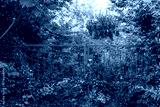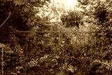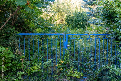 Geschlossenes Gartentor vor einem zugewachsenen Garten