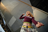 Caucasian girl dancing outdoors under urban structure, looking confident with expressive body language, wearing casual streetwear, representing Gen Z youth culture