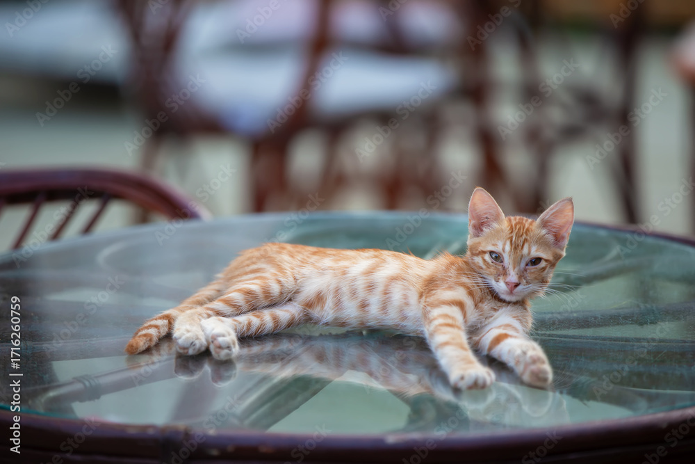 Cat lounging lazily on a glass table in an outdoor setting during daylight hours