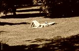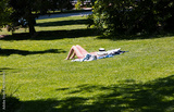 Blonde woman sunbathing on the grass wearing a white bikini - El Retiro park, Madrid, Spain