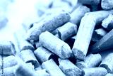 closeup wood pine pellet for pet litter or bed on white table background