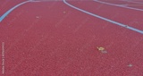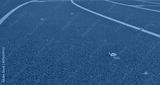 View of an athletic track. Tartan surface on an athletic field with lanes. Concept of sports, running tracks, and athletics.
