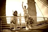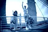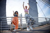 Two Gen Z girls dancing energetically on urban bridge, raising arms and wearing sunglasses, expressing carefree youthful attitude outdoors