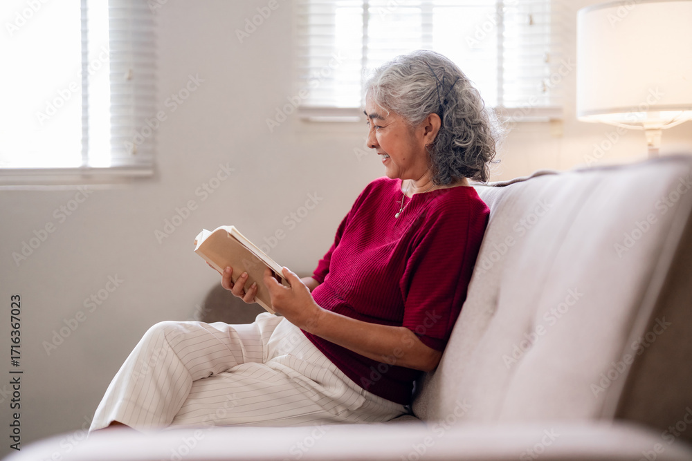 Asian older woman reading book happily living room peaceful domestic environment enjoying leisure time comfortable home senior female wellness