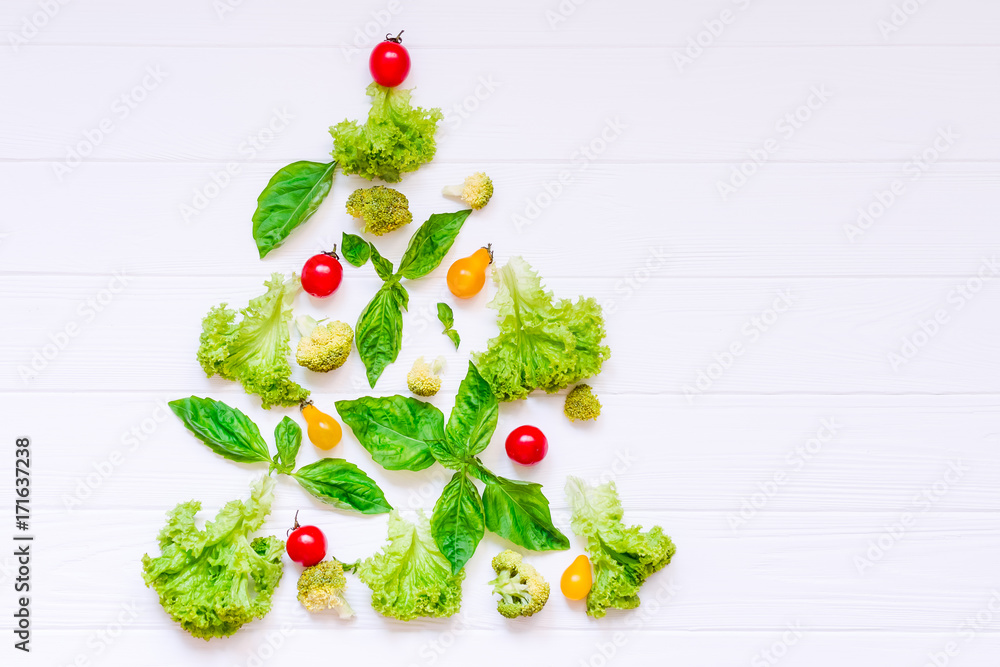 Healthy new year concept - Collection of fresh organic vegetables and greeens in form of christmas tree on white wooden background. Top view. Selective focus. space for text