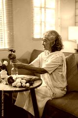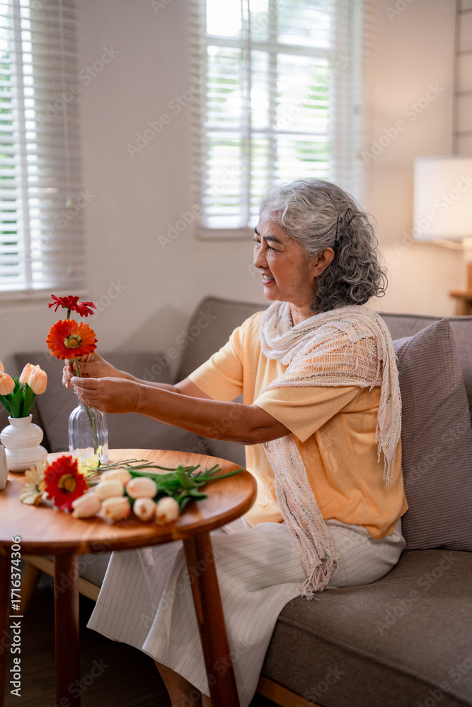 Asian older woman happy arranging fresh flowers home living room senior female enjoying tranquil domestic hobby cheerful decorating lifestyle indoor space