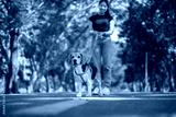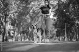 Happy Asian woman owner with her beagle dog having fun walking and training in dog park during summer morning, cheerful bonding and active outdoor lifestyle