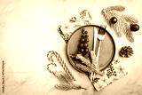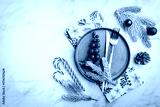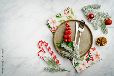 Christmas table setting with fir branches and holiday decorations on white marble background, flat lay Christmas and New Year background