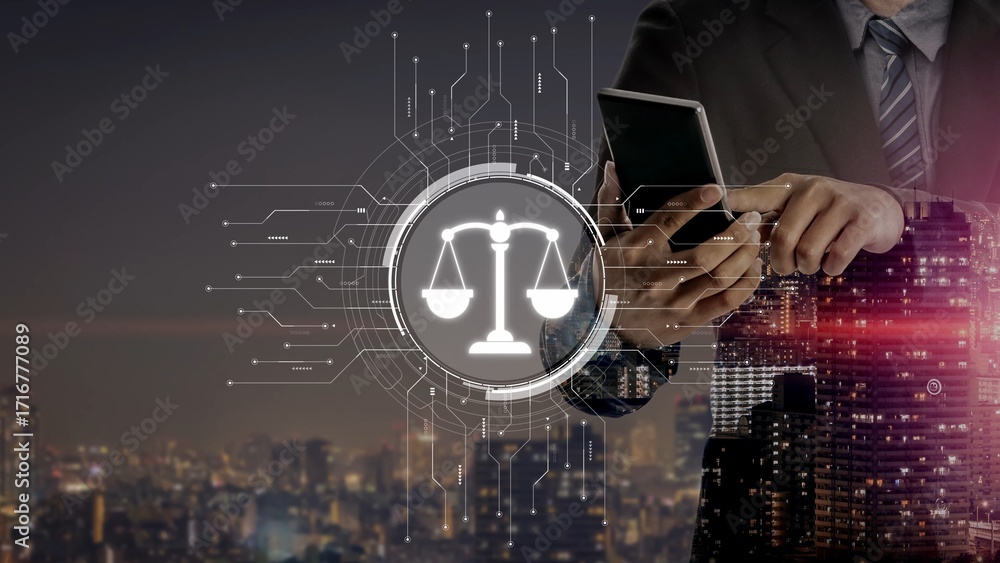 Futuristic digital law interface displaying justice scale, highlighting digital law, AI compliance, digital law systems, and digital law regulations for secure governance. Muxer