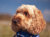 Adorable close-up of a golden cockapoo dog with curly fur wearing a harness, captured outdoors in natural light with a soft blurred background